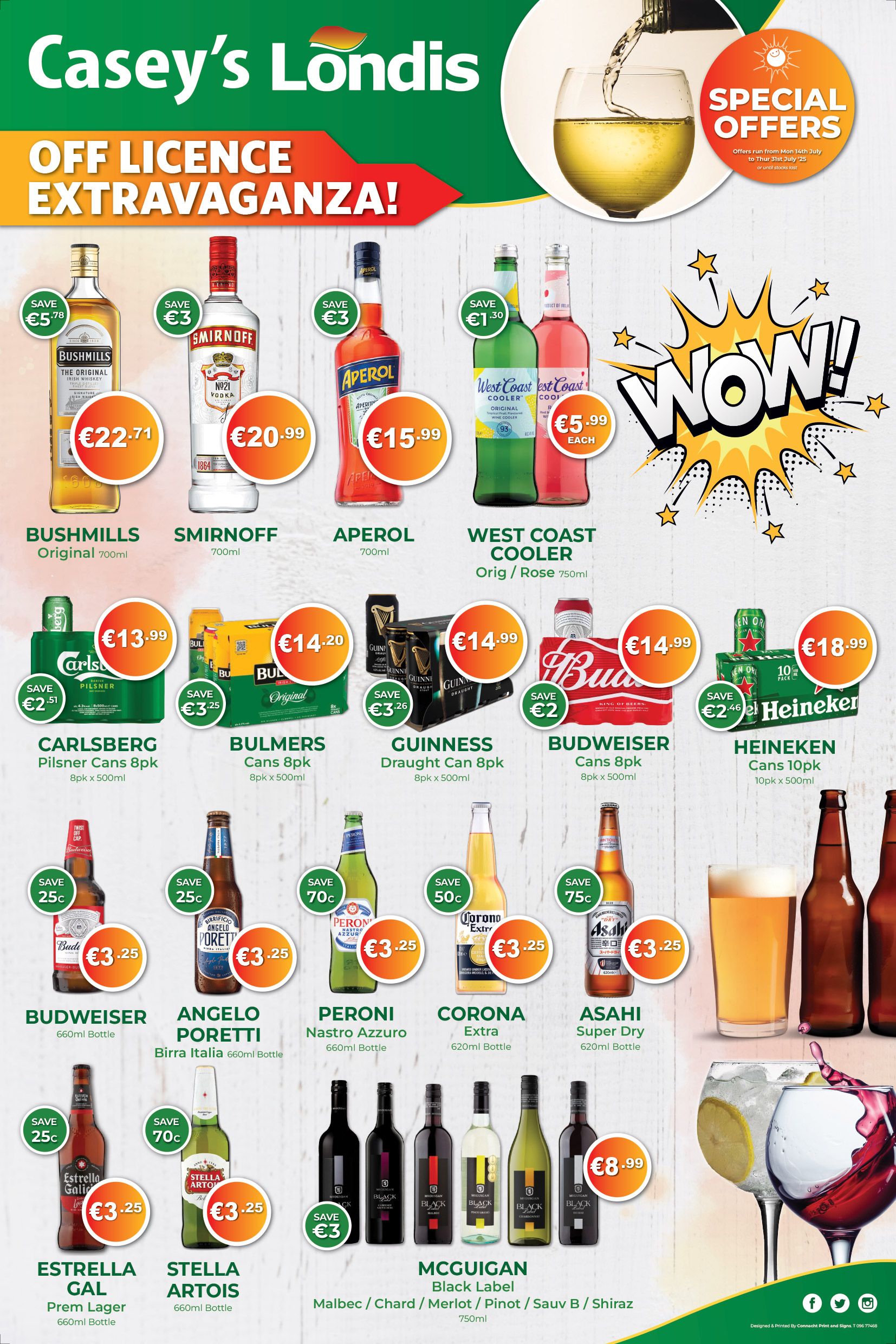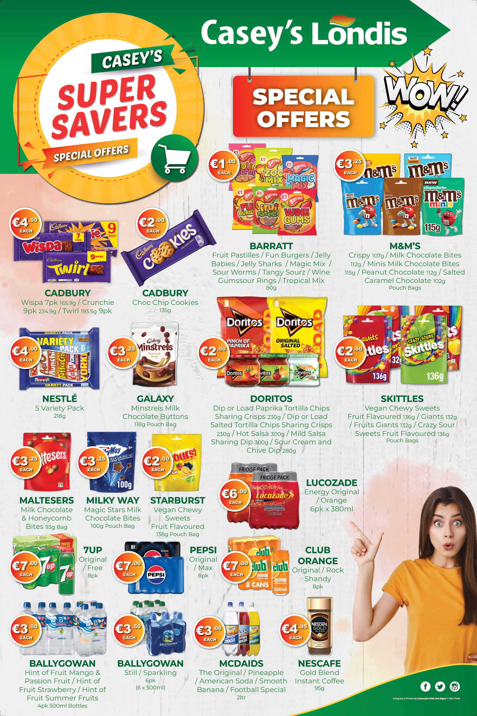 At Casey’s Londis we have a wide variety of Special Offers across all Categories of Fresh, Grocery, Alochol, Household, Confectionary and Minerals. Drop instore today to pick up our leaftlet